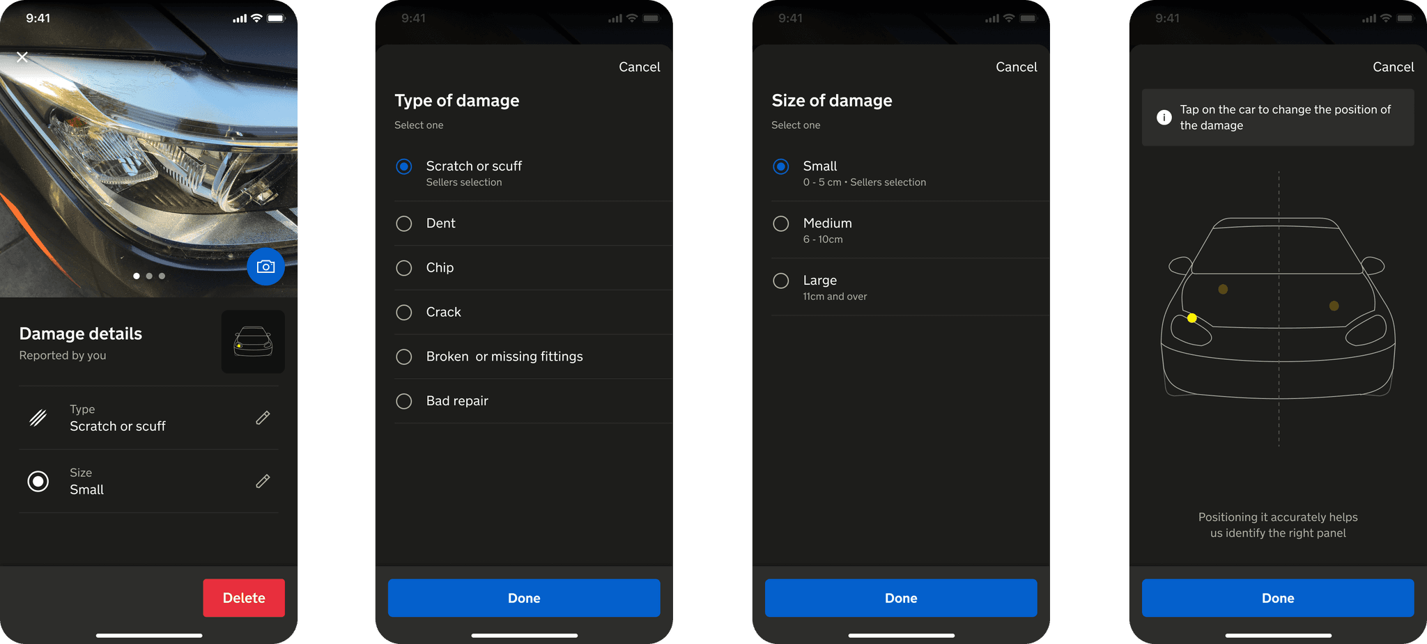 We addressed this by introducing structured fields for type, size, and location of damage. Much like the seller flow, drivers were prompted to: